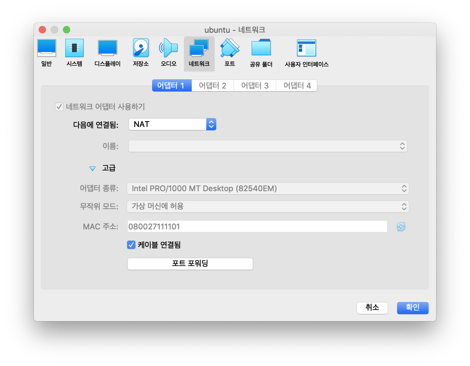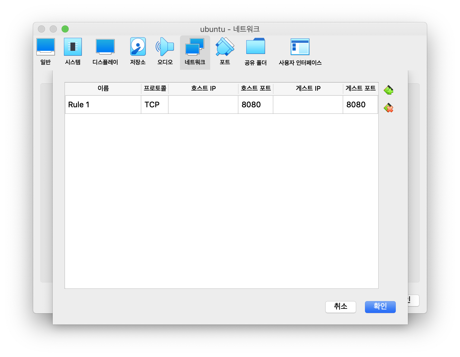 설정 > 네트워크 > 고급 > 포트포워딩 > 추가 에 들어가 호스트 포트와 게스트 포트를 각각 8080 으로 설정해둔다.
