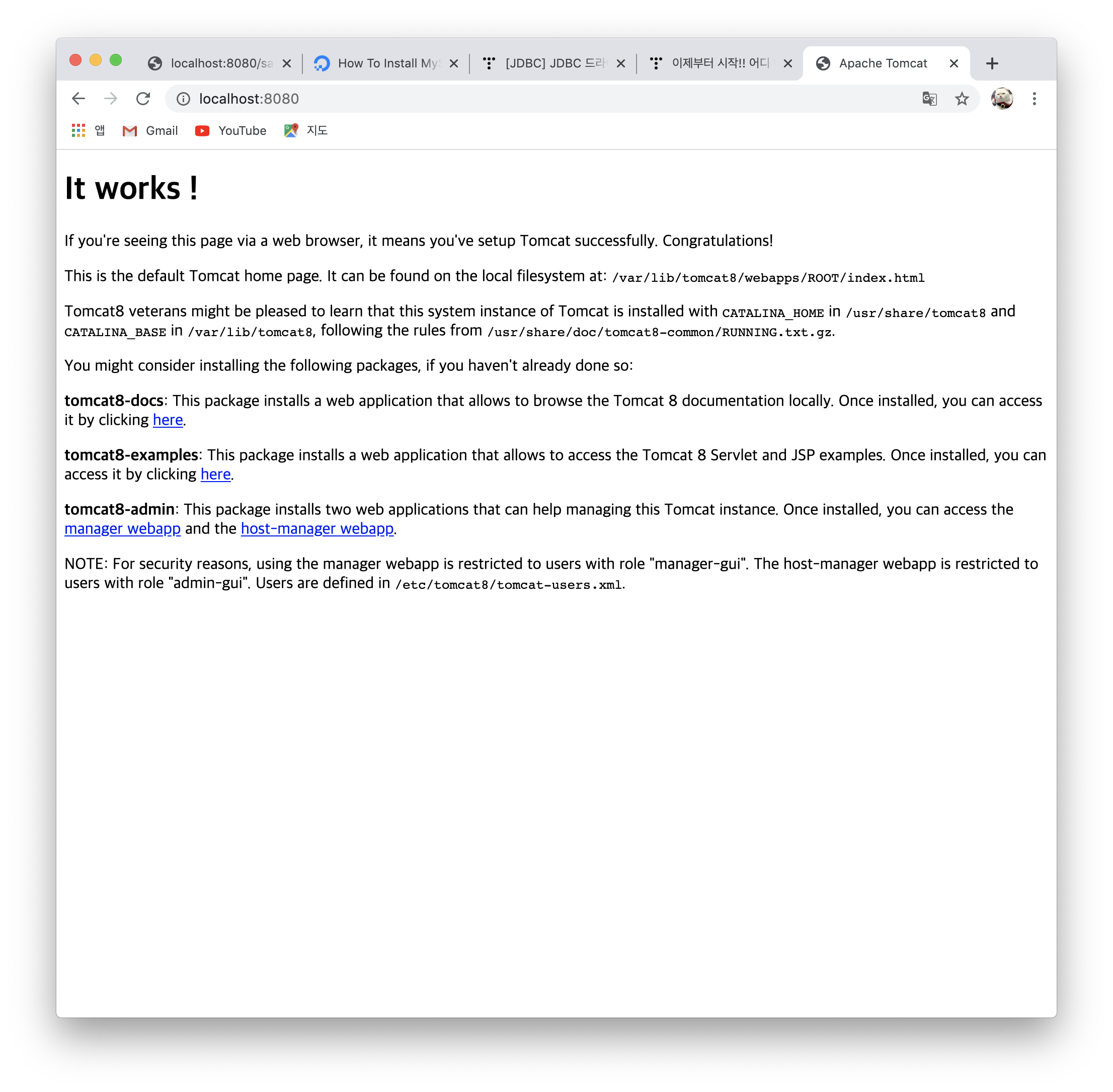 localhost:8080 으로 들어갔을 때 위 화면이 나오면 tomcat 서버 접속 성공이다 👏